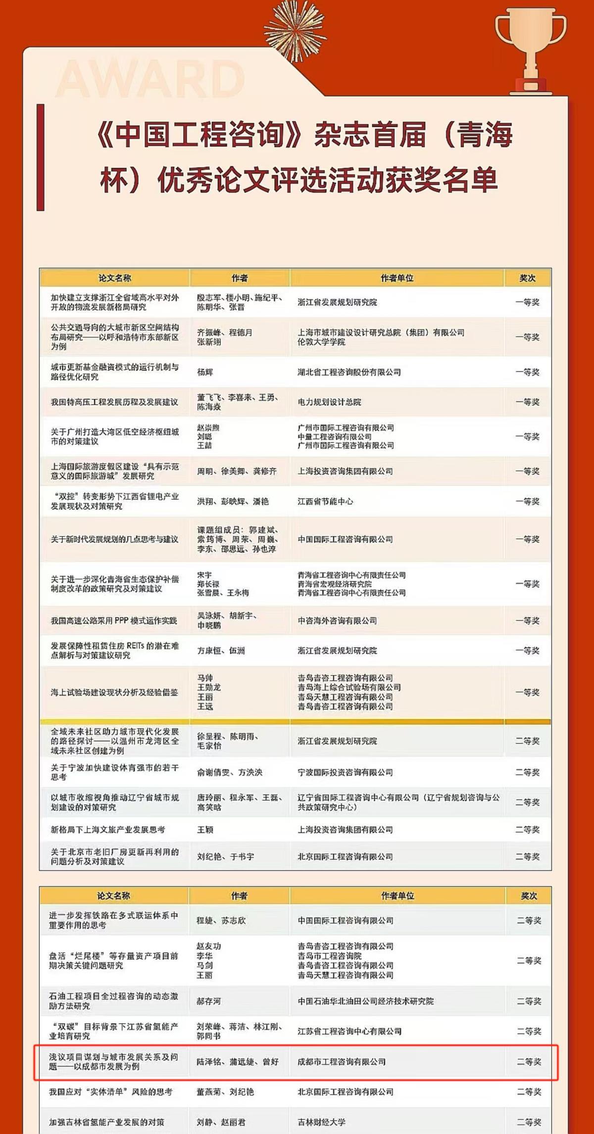 2024年8月7日,《中國工程咨詢》雜志首屆(青海杯)優(yōu)秀論文評選結(jié)果揭曉。成咨公司規(guī)劃與政策咨詢事業(yè)部陸澤銘、蒲遠(yuǎn)婕、曾好發(fā)表在2023年第11期的《淺議項(xiàng)目謀劃與城市發(fā)展關(guān)系及問題——以成都市發(fā)展為例》一文在激烈的競爭中脫穎而出,成功獲得本屆優(yōu)秀論文評選二等獎。