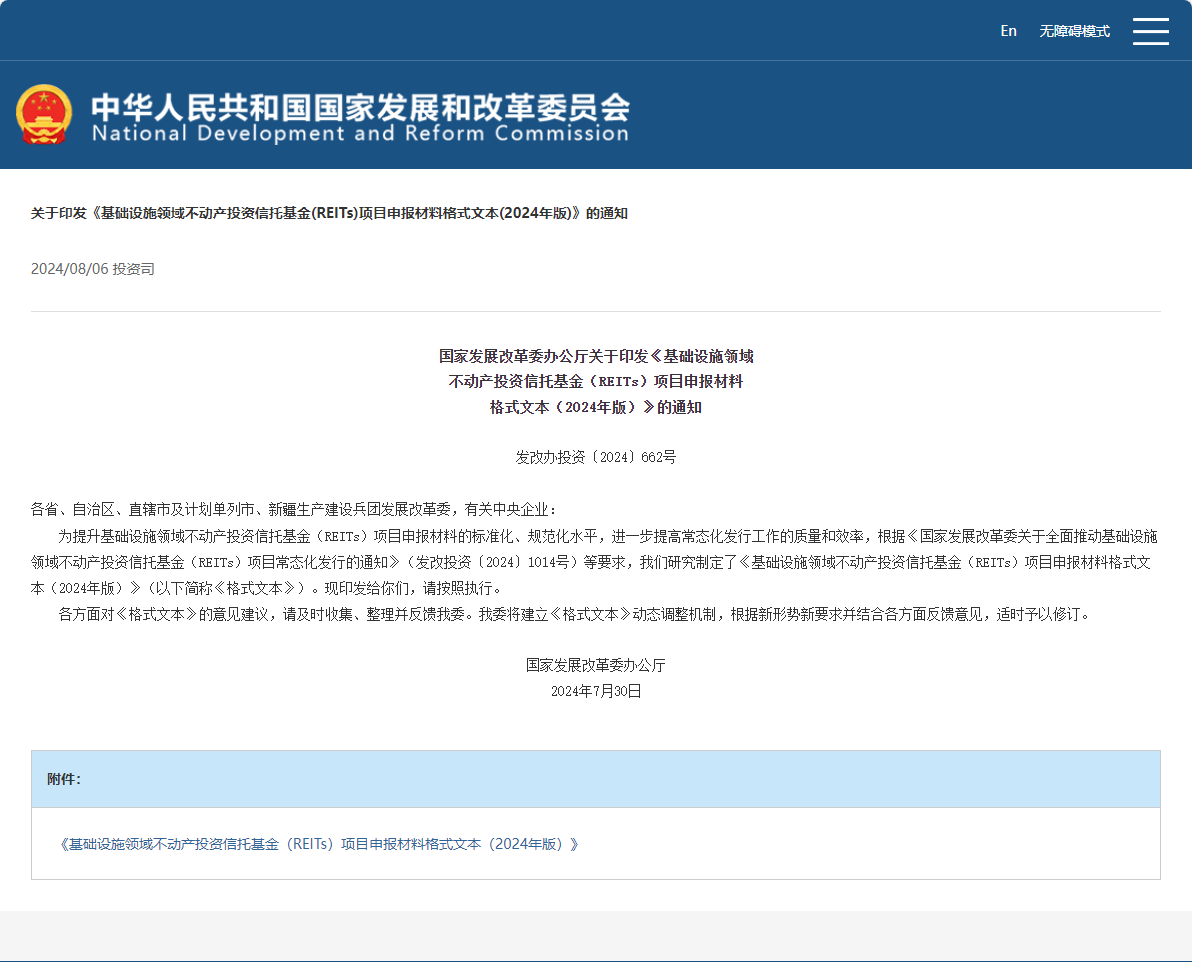 國家發(fā)展改革委辦公廳關(guān)于印發(fā)《基礎設施領(lǐng)域不動產(chǎn)投資信托基金(REITs)項目申報材料格式文本(2024年版)》的通知 發(fā)改辦投資〔2024〕662號各省、自治區(qū)、直轄市及計劃單列市、新疆生產(chǎn)建設兵團發(fā)展改革委,有關(guān)中央企業(yè):  為提升基礎設施領(lǐng)域不動產(chǎn)投資信托基金(REITs)項目申報材料的標準化、規(guī)范化水平,進一步提高常態(tài)化發(fā)行工作的質(zhì)量和效率,根據(jù)《國家發(fā)展改革...